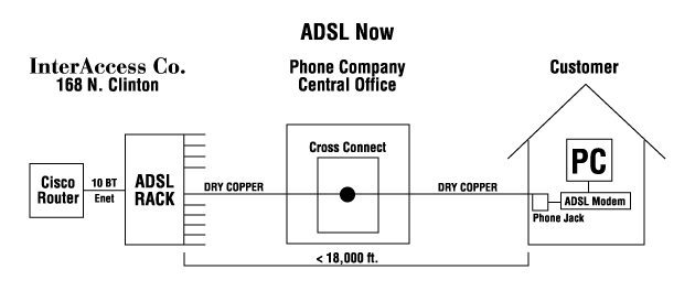 The figure above describes how ADSL operates using dry copper cabling over distances of <1800ft. This does not allow you to be online and use your phone at the same time.